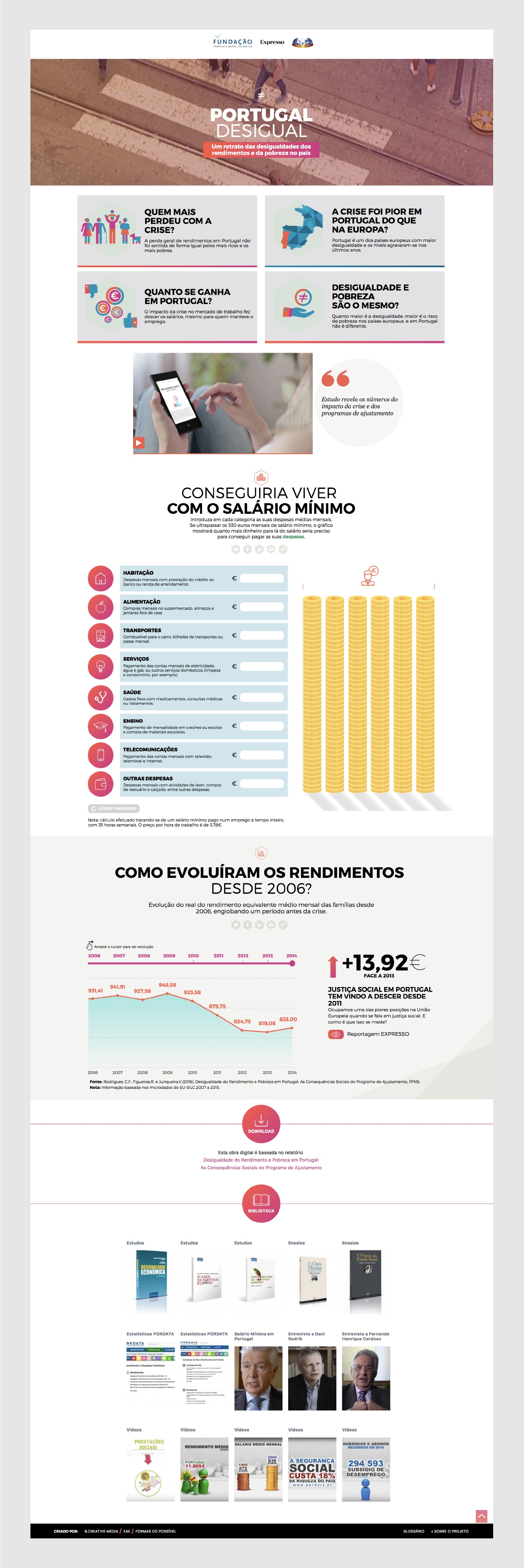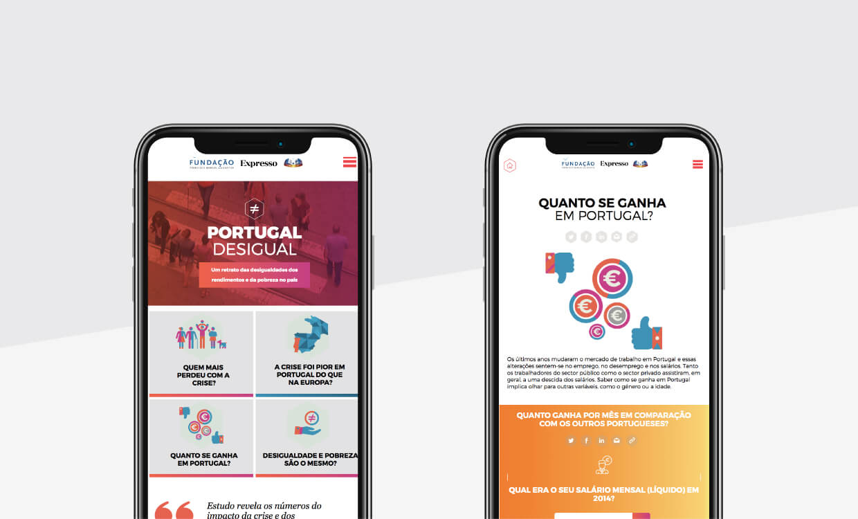 This is the question behind the study published by Fundação Francisco Manuel dos Santos in partnership with Expresso newspaper and tv network SIC. The conclusions are now available on "Portugal Desigual", a multimedia platform about poverty and inequality in Portugal during 2014-2019. Our challenge was to create a responsive website, highly visual and interactive when presenting the study’s results, giving the user access to four main questions (the areas of the website) answered via infographics, illustration, and video.