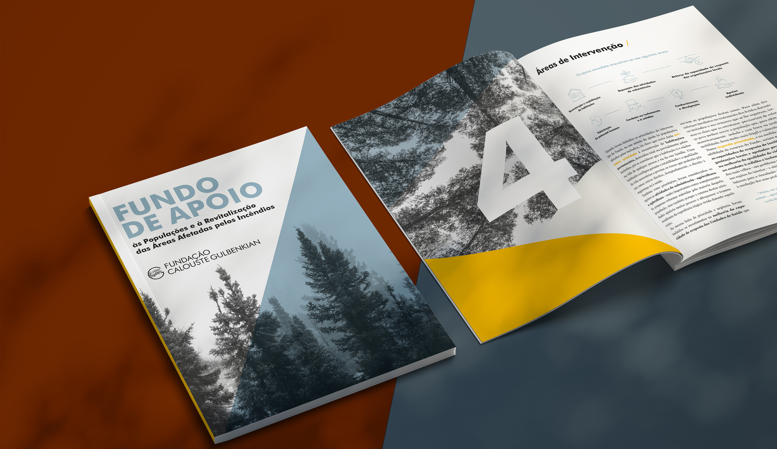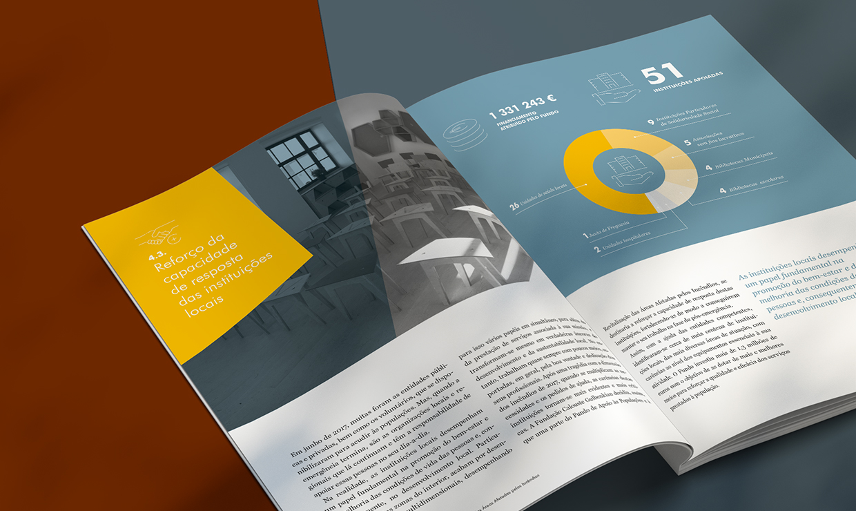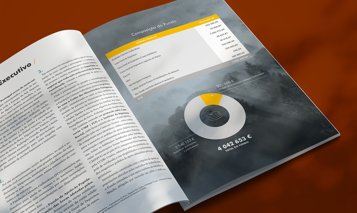 The fires that occurred in Portugal in 2017 were particularly tragic, with severe human and material losses. Following the fire between 17 and 23 June 2017 in the Central region, an unprecedented support movement was established in Portugal, with several institutions, companies and anonymous citizens joining forces and showing a willingness to support the victims of that tragedy. The Calouste Gulbenkian Foundation immediately provided €500,000 from its own funds to support the affected populations and was subsequently asked to manage the funds provided, for the same purposes, by various citizens and businesses. The approved investments and support were organized in the areas of housing reconstruction, replacement of losses in subsistence activities, strengthening of the capacity and quality of social responses at local and regional level, enhancing human potential and combating loneliness and isolation. This brochure summarizes the investments made in each area.